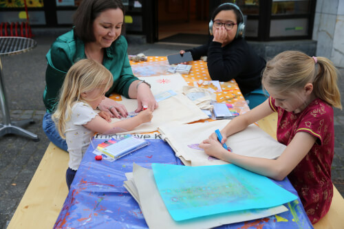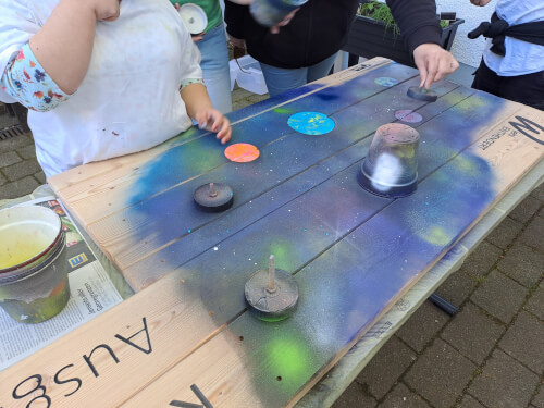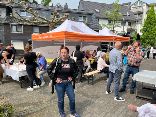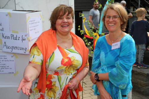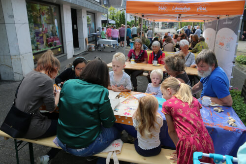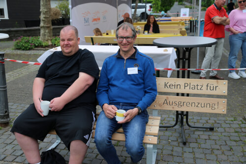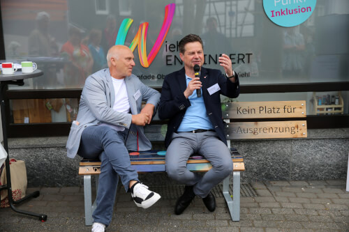 In diesem Rahmen fand am 3. Mai ein offener Aktionstag des Netzwerkes Wiehl ENTHINDERT * vor dem Treff-Punkt Inklusion statt. Den Impuls dazu gab eine „Bank gegen Ausgrenzung“, die Ulrich Pflitsch, Vorstandsvorsitzender des Vereins Lebenspfade Oberberg e.V., erworben und an das Netzwerk gespendet hatte. Ende April wurde die bis dahin naturfarbene Bank in einem gemeinsamen Projekt des städtischen Jugendzentrums in Drabenderhöhe und Schüler*innen der Helen Keller Schule in einer Graffitiaktion bunt gestaltet. Am 3. Mai nun wurde sie der Öffentlichkeit im Rahmen einer offenen Kaffeetafel präsentiert. Rund 100 Menschen folgten der Einladung zu „Kaffee, Kuchen & Klönen“ am Treffpunkt.Inklusion und zeigten so Haltung gegen Ausgrenzung. An einer langen Kaffeetafel konnte man miteinander ins Gespräch kommen und Kuchen und Waffeln genießen. Gespendet wurden die Leckereien durch die OASe Wiehl und den BeWo-Beirat der HBW Heimat. Begleitung. Wohnen. GmbH.
